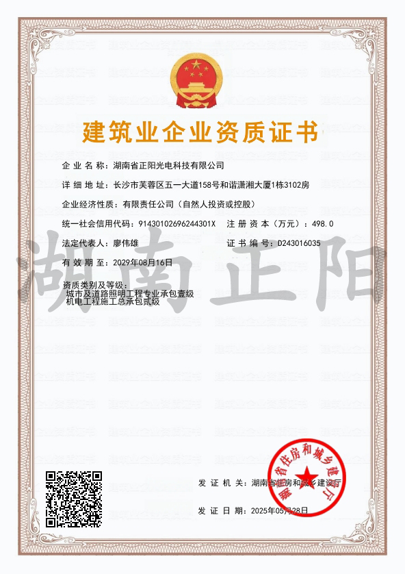 2025年4月8日,經長沙市住房和城鄉建設局審核批準,湖南省正陽光電科技有限公司成功獲得“施工勞務”資...